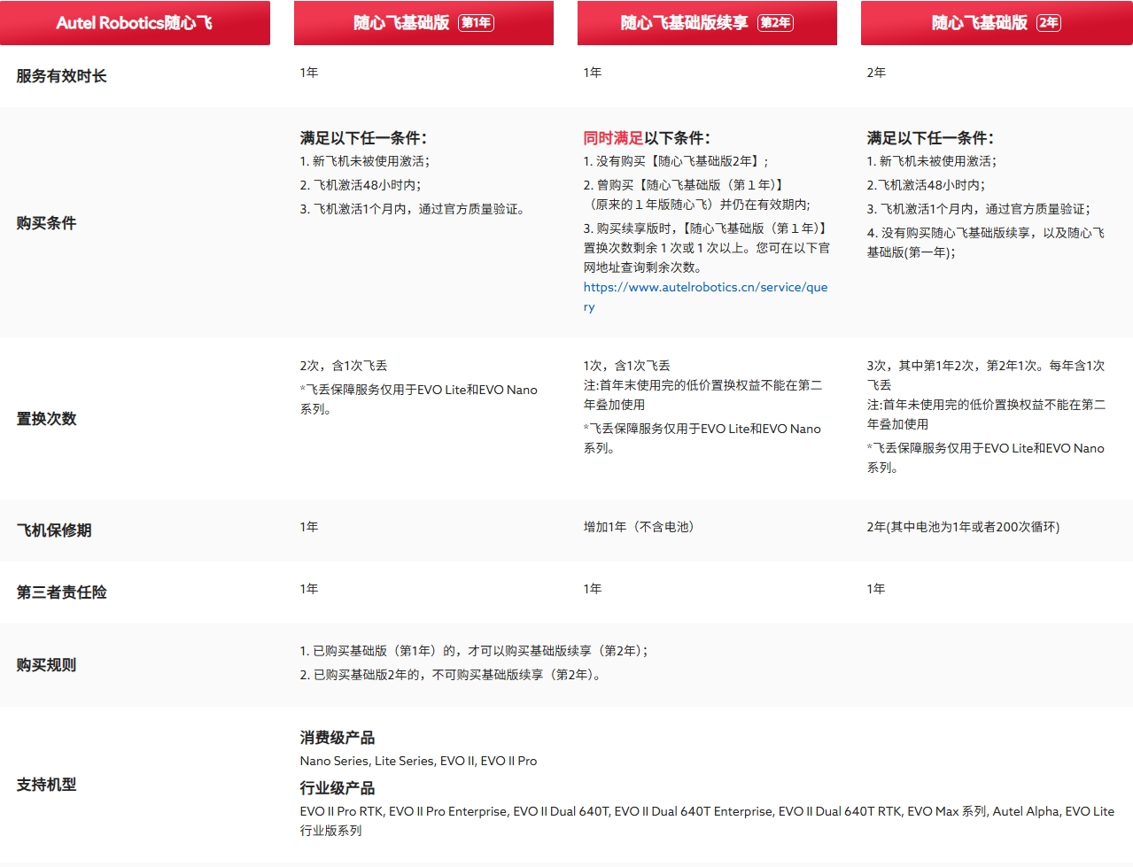 Autel Robotics为消费者提供符合区域部门要求或相关法律规定的质保服务,保修期内由于产品质量产生的产品问题均由我司提供免费质保;AUTEL ROBOTICS随心飞主要针对因正常使用或意外事故导致的产品损失。