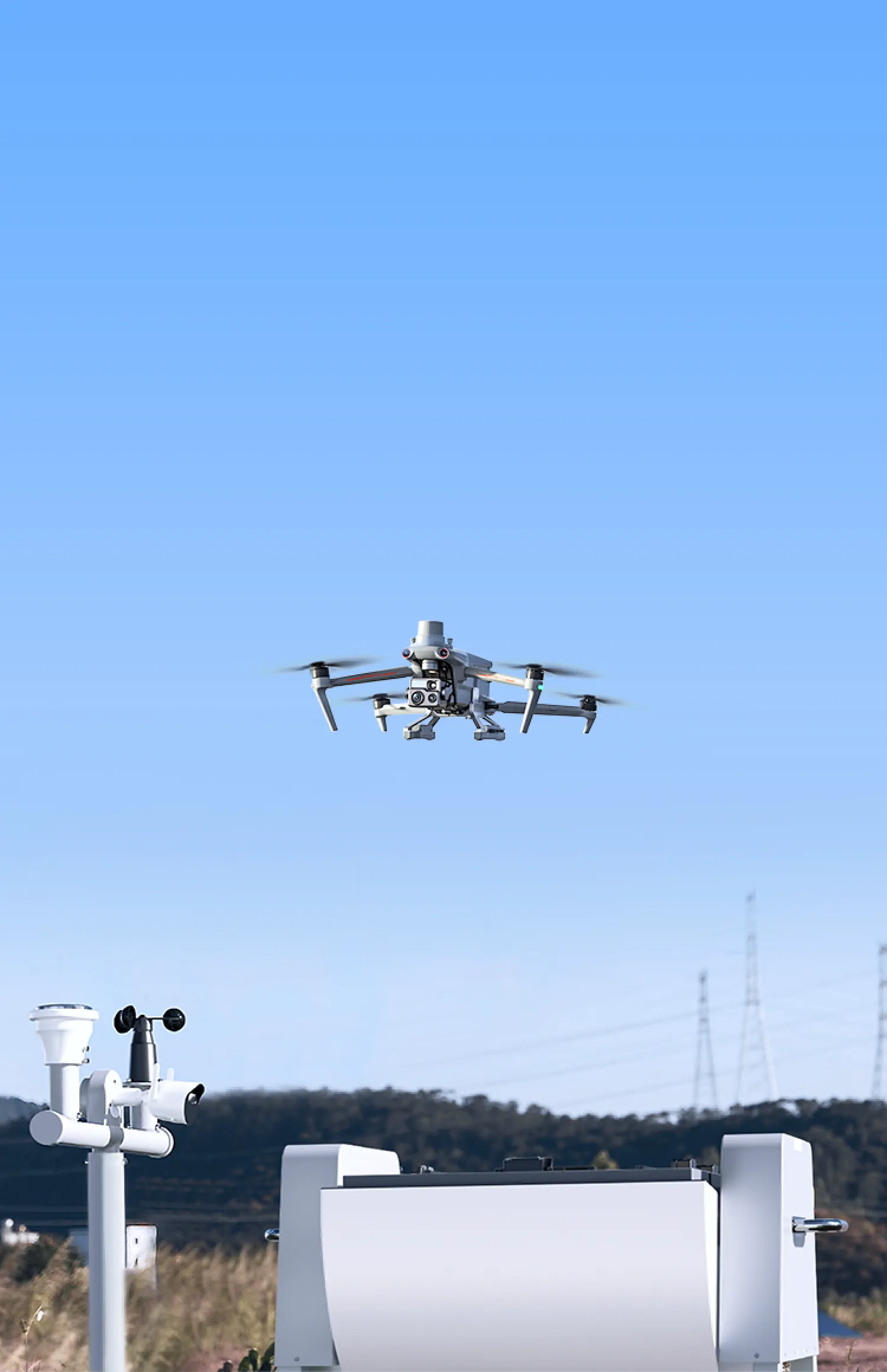 道通多旋翼机巢日常可部署于作业巡逻区域,实现无人机自动起飞、精准降落、回收停放、自动充电。